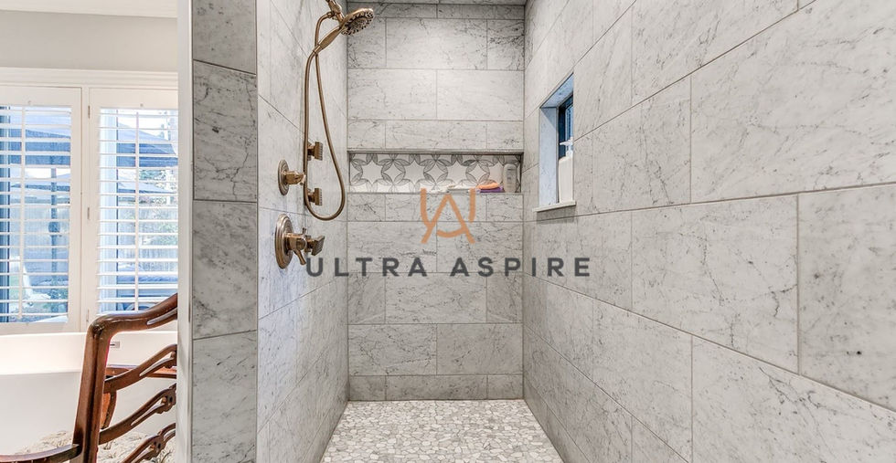 Exquisite quartz countertops with Carrera marble and Mother of Pearl accents.